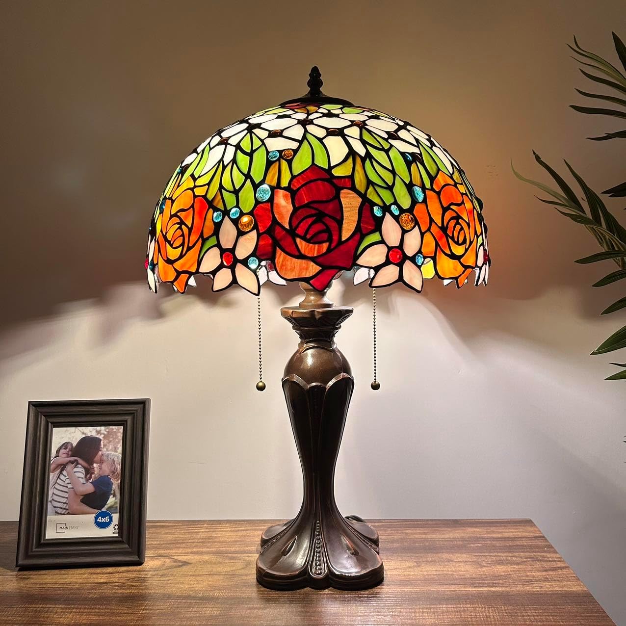 Resin base with painted finish. Each piece of stained glass is hand-soldered into place using the traditional copper foil technique.
