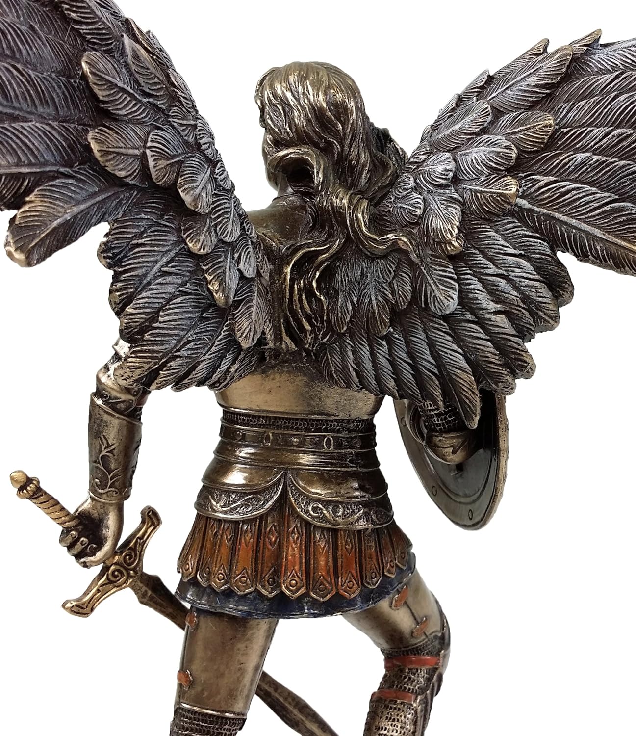 A pair of Archangel statues featuring: Saint Michael wielding heavenly sword and shield standing on top of his demonic opponent. Saint Gabriel wielding his divine banner and trumpet.