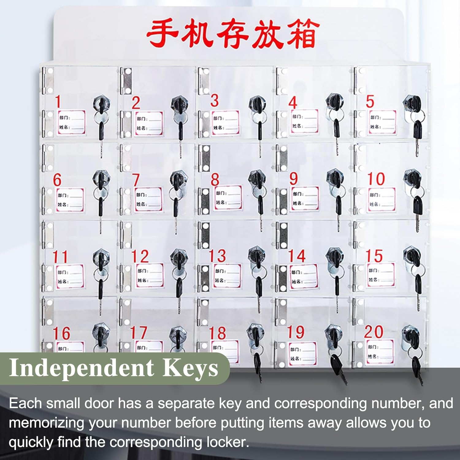 Are distractions during work hours affecting your productivity? Concerned about misplacing your phone at the gym? Our Cell Phone Locker is the perfect solution for keeping your device secure and accessible, allowing you to focus on what matters most. **Specifications** - **Material**: Durable Acrylic - **Lock Material**: Stainless Steel - **Shape**: Rectangular - **Mounting Type**: Freestanding - **Installation**: No assembly required **Features** - **Versatile Compatibility**: Designed to accommodate a wide range of cell phone models, ensuring your device fits securely. - **Unique Key System**: Each key is uniquely matched to its corresponding lock, enhancing security and convenience. - **Robust Construction**: Crafted from thickened, high-quality materials, our locker is built to last while remaining easy to clean and maintain. - **User-Friendly Design**: With no assembly required, you can start using your locker right out of the box. **Package Includes** - 1 x Cell Phone Storage Cabinet - Independent Keys and Locks **Important Note** - Please allow for slight measurement variations due to manual measurement. Actual sizes may differ from those listed. - Monitor settings may affect color representation; slight color variations may occur between the actual product and images. **Customer Support** We are committed to providing quality service. If you have any questions or need assistance, our customer support team is available 24/7 to help you. Enhance your workspace or gym experience with our Cell Phone Locker, where convenience meets functionality!