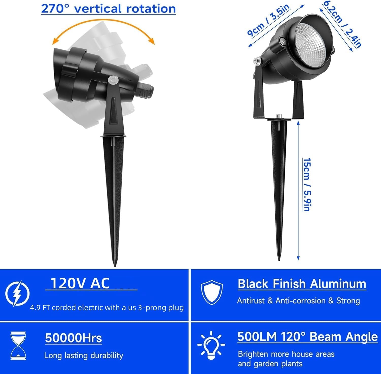 Features:1,Low power consumption, COB efficient light, CRI2,Energy saving and environmental protection, handsome in appearance, easy to install3,Constant current output, stable performance without flicker, 50,000 hours long life4,Ideal for outdoor use, such as lawns, courtyards, lanes, roads, landscapes, gardens, parks, hotels, etc.Basic parameters:Product Name: COB Lawn LightApplicable voltage: Between 85-265VMaterial: Die-cast aluminumSize: approx. 60 * 77 * 220mm (height includes spike base height)Light body color: black,Working voltage: Between AC 85-265V,Wattage:10WFrequency range: 50-60Hz,Beam angle: 120 degreesLuminous flux: 1000lm,Wick COB Color: Warm White,Color temperature: 3000-3500KPower cord length: 1.5 m / 4.9 ft (with US regulatory plug)Waterproof rating: IP65,Life: 50,000 hoursEnvironmental protection, energy saving, stability, safe and reliable, energy efficient, no UV, infrared or other harm radiationPackage:1x5w outdoor landscape lighting + 1.5M US plug + 1 pcs hex wrenchInstallation Precautions:1, the work must be cut off before the installation of power to prevent electric shock;2, not in the heat source or easy to rust at the installation, so as not to affect the service life;3, the project to ensure that the installation location can withstand 10 times the weight of the LED spotlight, no vibration, no swing or no fire hidden plane position;4, must be professional maintenance products, non-professional staff shall not be removable fixture