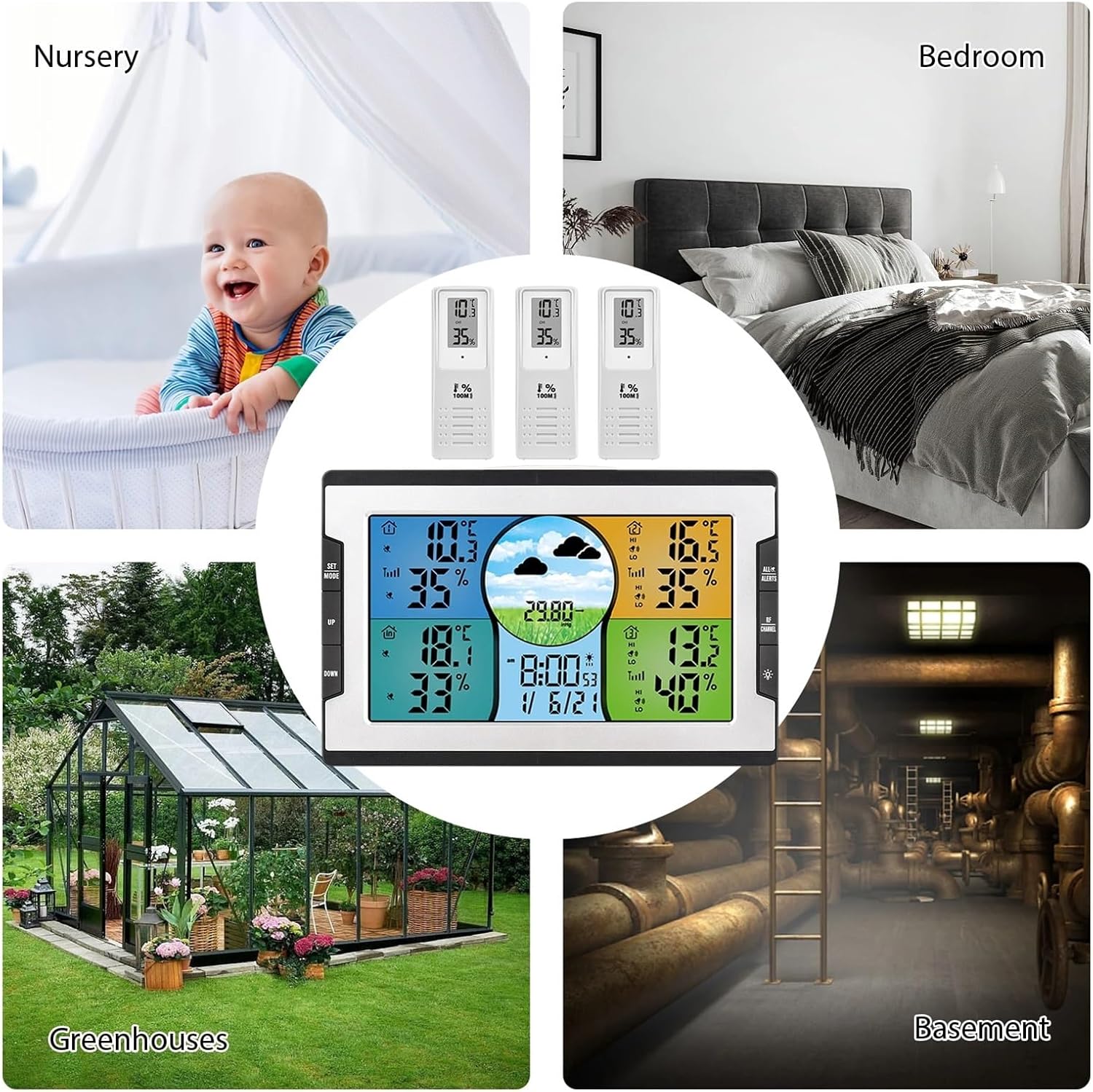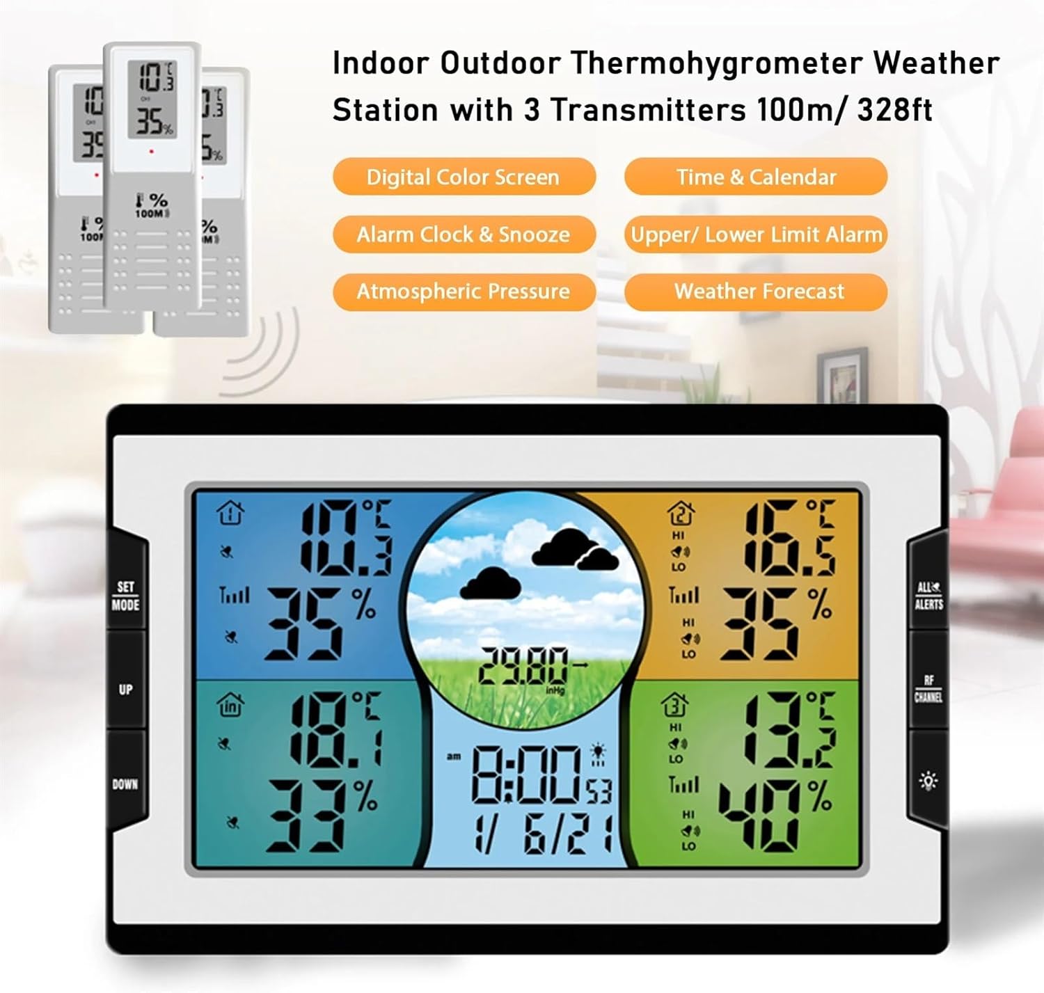 [12H/ 24H & Switchable] 12 or 24 hours time format switchable. Change the temperature display to or . [Power Supply] 3 * 1.5V AAA battery or AC 5V power supply for the main unit; 2 * 1.5V AA battery to power each remote sensor. (Batteries are not included) Note: Size and color may be slightly different because of manual measurement and different light conditions. Thanks for understanding. Specifications: Color: Black & Silver Material ABS Screen Digital Screen with Backlight Indoor Temperature Range: -10~50 (14~122) Outdoor Temperature Range: -40~70 (-40~158) Humidity Range: 10%-99% RH Temperature Unit: / Selectable Indoor Temperature/ Humidity Detection Cycle: 30S Weather Forecast: Yes Atmospheric Pressure Range: 23.62InHg~32.48InHg (800hPa~1100hPa); Default: 29.92nHg (1013hPa) Transmission Range: about 100m/ 328ft (open distance without obstacle) Power Supply: Receiver: AC 5V Power Supply or 3 * 1.5V AAA Battery (Not included); Transmitter: 2 * 1.5V AA Battery (Not included) Receiver Size: 207 * 135 * 24mm / 8.15 * 5.31 * 0.94in Transmitter Size: 125 * 46 * 25mm / 4.92 * 1.81 * 0.98in Package Size: 22 * 14.5 * 7.5cm / 8.66 * 5.71 * 2.95in Package Weight: 635g / 1.40lbs Package List: 1 * Weather Station (Receiver) 3 * Remote Sensor (Transmitter) 1 * USB Cable 1 * User Manual (English)