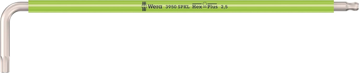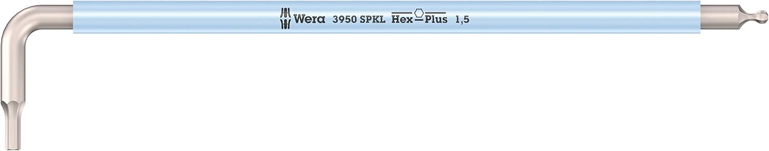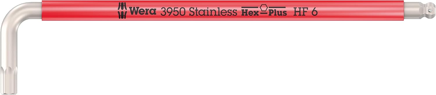 Premium stainless steel Wera L-keys for hexagonal socket screws. Stainless steel prevents transmission of extraneous rust. The Hex-Plus profile offers larger contact surfaces in the screw head. The notch effect is reduced to a minimum and the destruction of the screw is nearly eliminated. With hexagonal ball tip at the long arm: The ball-shaped tip profiles enable the tool shaft to be moved and pivoted relative to the screw axis which allows screwdriving "around the corner". From size 3.0 with holding function for hexagonal socket screws on the long arm. "Take it easy" tool finder with colour coding by size. In a nearly wear-free L-key clip. Includes: 1x 3950/9 Hex-Plus Multicolour HF Stainless 1 L-key set, metric, stainless steel, with holding function, 9 pieces; 3x 3950 SPKL Multicolour L-key, metric, stainless: 1.5x90, 2.0x101, 2.5x112; 6x 3950 SPKL Multicolour HF L-key, metric, stainless steel, with holding function: 3.0x123, 4.0x137, 5.0x154, 6.0x172, 8.0x195, 10.0x224